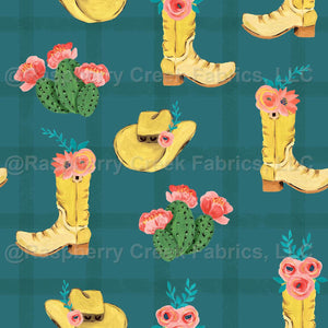 Playful and girly Western-themed pattern with cowboy boots, hats, and blooming cacti on a soft green plaid background. Perfect for Southwestern decor and fashion. Teal