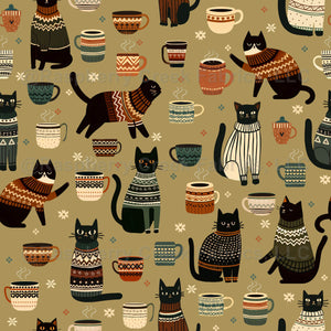 Cozy cats dressed in sweaters and tea cups in a green sage background. Hand drawn pattern perfect for fall decor for cat lovers.