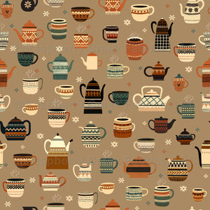 Handdrawn coffee and tea cups and kettles in terra beige background.
