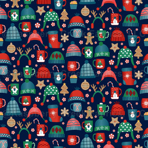 Colorful hats and mugs on a navy for Christmas decor and apparel. Part of the Cozy Christmas Collection.