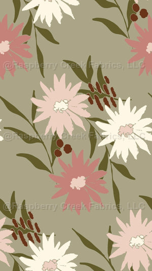 Cream and pink wildflowers on olive green background with abstract elements