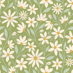 Embrace the beauty of simplicity with this Meadow Grace pattern. A meadow green canvas adorned with whimsical cream flowers in a delightful, random dance.