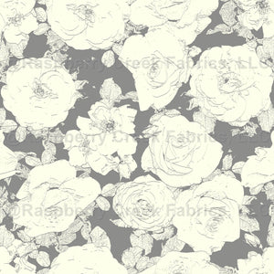 Creamy yellow roses stamped on pewter gray create a lovely fabric design.