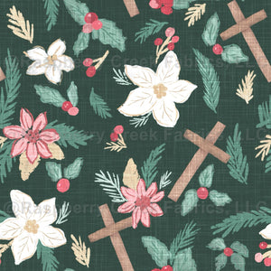 Cross, Christian, textured, tossed, berries, white, holly, floral, pine, botanical, winter, dark green, pink, girls, women, Christmas, red, green, poinsettias