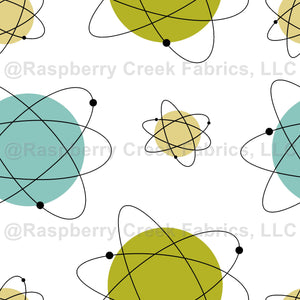 Add some fun to your sewing projects with this cute aqua blue, avocado green, yellow, and black atomic age atoms mid century modern fabric.