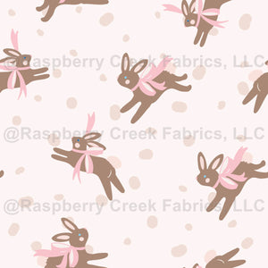 Sweet bunnies for Easter, spring, and nursery. Little jumping brown bunnies with pink bows on a pale pinkbackground accented with soft free form dots is perfect too for baby girls.