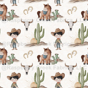 This soft cream version highlights the sweet watercolor cowboy, his horse, and all their western desert surroundings—sunrise, cactus, horseshoes, and steer skulls, creating a whimsical and friendly cowboy scene. Perfect for nursery décor, baby clothes, quilts, pajamas, and boutique western collections, this seamless repeat offers a warm, storybook western aesthetic.