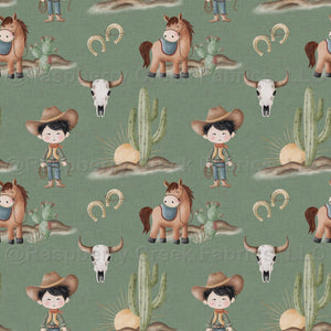 This sage green version brings a calm, earthy feel to the playful cowboy and horse print. Featuring watercolor illustrations of a cheerful cowboy, his loyal horse, steer skulls, cacti, and a warm desert sunrise, this design is ideal for baby clothes, toddler outfits, quilts, bedding, and western-themed décor. The linen-style background adds soft texture for a cozy handmade look.