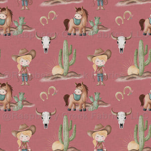 This charming dusty rose western design features a friendly cowgirl, her horse, desert plants, sunset scenes, horseshoes, and cow skulls—all painted in a gentle watercolor style. The warm pink background adds a sweet, feminine western touch, making it perfect for dresses, tees, quilts, baby outfits, and themed décor. Designed as a seamless repeat for easy sewing.