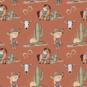 Set on a warm terracotta backdrop, this delightful western print features a sweet cowgirl character, her loyal horse, desert cacti, skulls, and horseshoes in soft watercolor textures. The earthy palette gives a rustic yet playful feel, perfect for children’s clothing, quilts, nursery projects, and boutique western apparel. Seamlessly designed for beautifully smooth sewing.