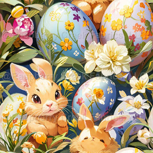 Cute Easter Bunnies with Sring Flowers and Easter Eggs
