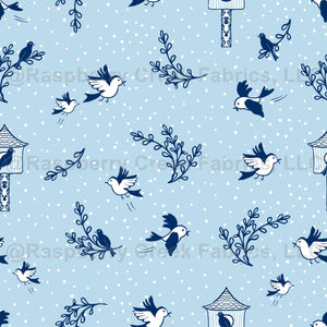 Cute, flying birds and bird houses in blue tones pattern print by Annette Winter
