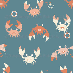 Bring a splash of seaside fun to children's clothing with this nautical design. Set against an ocean-blue background, this whimsical design features adorable cartoon crabs, lifebuoys, and navy anchors—perfect for a fun and maritime look. Ideal for kids’ t-shirts, pajamas, swimsuits, or summer outfits, this design adds a touch of marine magic to every stitch. Whether you're sewing for a beach vacation or just love a sea-themed aesthetic, this charming crab fabric is a must-have for any creative project.