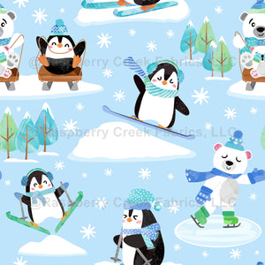Cute Penguin Polar Bear Winter Sports Light Blue. Skiing, sledding, snowboarding, and ice skating animals.