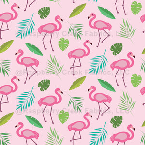 This is cute pink flamingo pattern with tropical palm leaves on light pink background