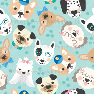 This cute pattern features several breeds of dogs on a teal background.