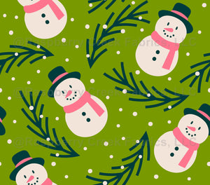 Playful snowmen with evergreen branches and soft snow on a green background. A cozy holiday design for decor and gifts.