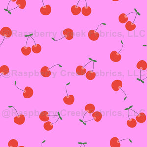 Playful, juicy and plump red cherries with green leaves dance across a bright neon pink background. Available in many colors.