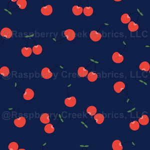 On trend! Playful, juicy and plump red cherries with green leaves dance across a dark navy blue background. Available in many colors.