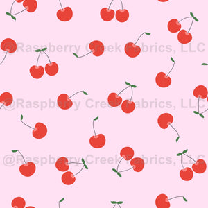 On trend! Playful, juicy and plump red cherries with green leaves dance across a pale pink background. Available in many colors.