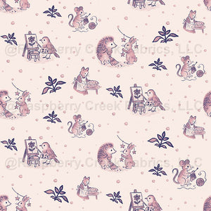 This tossed “Storybook Critters” kids design scatters four sweet picture-book scenes - bird painting, cat baking pie, mouse knitting, and hedgehog with bunny and star garland - among simple leafy sprigs and gentle polka dots.