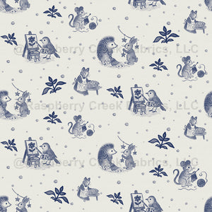 Add gentle storytime charm with these tossed “Storybook Critters” vignettes - bird painter, cat baker, mouse knitter, and a hedgehog and bunny hanging star garlands - sprinkled between leafy sprigs and soft polka dots.
