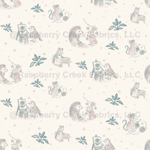 “Storybook Critters” turns classic picture-book moments into a charming tossed pattern: a bird painting, a cat baking pie, a mouse knitting, and a hedgehog and bunny hanging star garlands, scattered with leafy sprigs and soft polka dots.