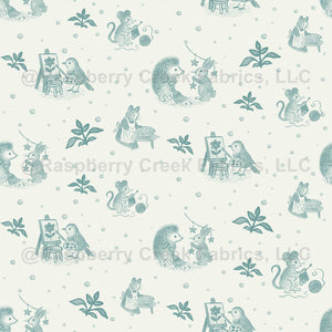 Bring a peaceful storytime mood to your space with tossed “Storybook Critters” vignettes - bird artist, cat baker, mouse knitter, and hedgehog plus bunny with star garland - floating between leafy sprigs and subtle polka dots.