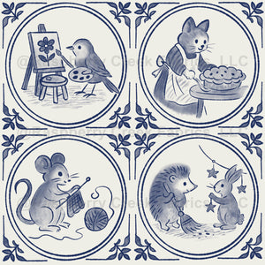 Bring a cozy storytime feel with these framed “Storybook Critters” vignettes: a little bird painting a flower, a cat baking pie, a mouse knitting, and a hedgehog and bunny hanging star garlands.
