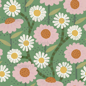 A bold watercolor floral with daisies and dahlia flowers in green, cream. pink and reds.
