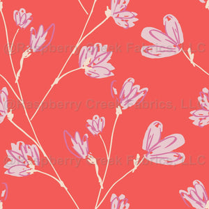 Trailing lilac flowers with peach colored stems adorn a bright coral red background for a sweet charming floral interior or apparel. Girls bedroom, swimwear summer or spring dresses, accessories and nursery decor.