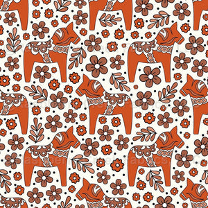 Dala Horse Floral in Orange Brown Tan on Ivory