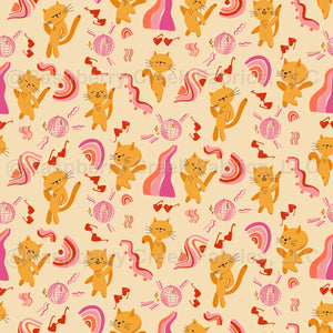 Dancing cats disco 70s style fabric in yellow, pink, orange colors with fun cats for kids baby scale