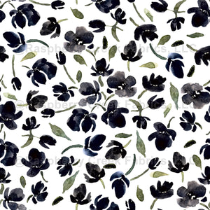 Darkest Blue-Gray watercolor wildflowers and olive green leaves and stems on a white background. Ditzy floral, modern floral, wildflowers, toss, wallpaper, fabric, home decor, cottage