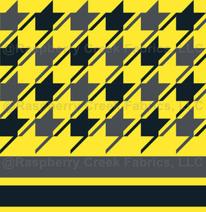 Dark teal and grey houndstooth and stripes, against a yellow background.