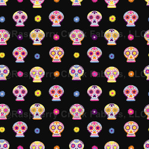 A pattern design featuring intricate and vibrant illustrations of sugar skulls and calavera masks, as a tribute to the traditional Mexican celebration Dia de los Muertos, also known as Day of the Dead.