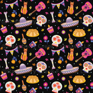 A pattern design featuring intricate and vibrant illustrations of sugar skulls, calavera masks, alebrije sculptures, ofrenda candles, flowers, mariachi band instruments and more, as a tribute to the traditional Mexican celebration Dia de los Muertos, also known as Day of the Dead.
