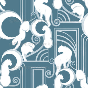 Art Deco inspired pattern with white panthers, moons and silver architectural and decorative lines.