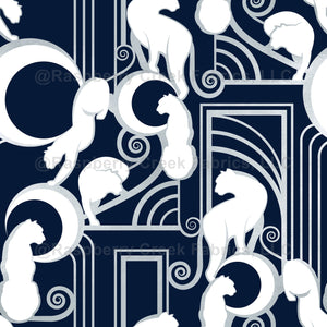 Art Deco inspired pattern with white panthers, moons and silver architectural and decorative lines.