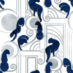 Art Deco inspired pattern with black panthers, moons and silver architectural and decorative lines.