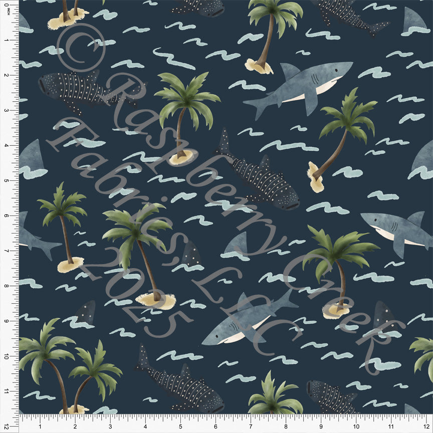 Deep Ocean Blue Navy Grey and Green Shark and Palm Print Fabric, Ocean Friends CLUB Fabrics