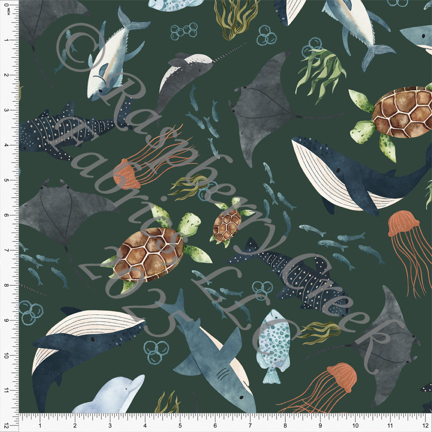 Deep Ocean Green Navy Brown Green and Grey Ocean Animal Print Fabric, Ocean Friends CLUB Fabrics