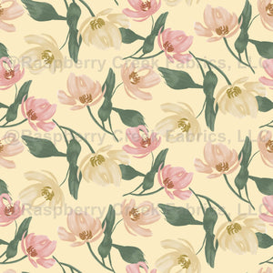 Delicate and feminine tossed florals in shades of yellow and peach on a light pastel yellow background.