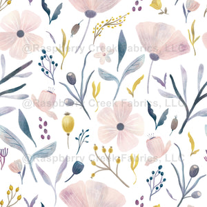 This pretty pattern features delicate pink, purple, blue, and yellow flowers on a white background.