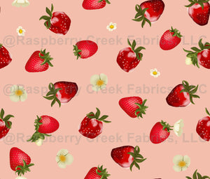 Juicy strawberries and blossoms on light pink backgorund, no AI art