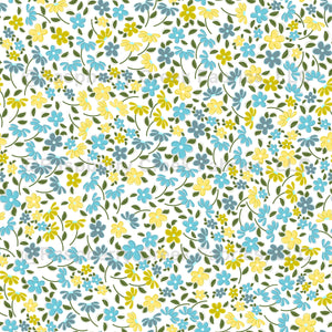 A dense ditsy floral in soft yellows and muted blues, perfect for nurseries, kitchens, bedrooms, and charming touches in any sewing project.