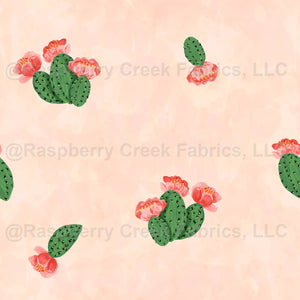 Soft Southwestern-inspired pattern featuring blooming green cacti with pink flowers on a light peach background. Ideal for trendy, desert-themed decor and apparel.