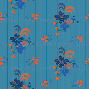 Abstract floral bouquets and nosegays in oranges and blues on a light blue background with blue pinstripes.