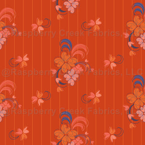 Abstract floral bouquets and nosegays in oranges, pinks, and blues on a bright red background with orange pinstripes.
