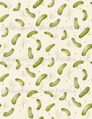 Whole green pickles with sprigs of dill herb and accented with brine spice on a textured pale yellow background.